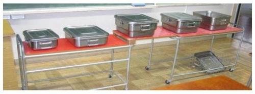 □学校へ配送された食缶は各学校内の配膳室へ運ばれ、給食が始まるまで配膳室で保管されています。
