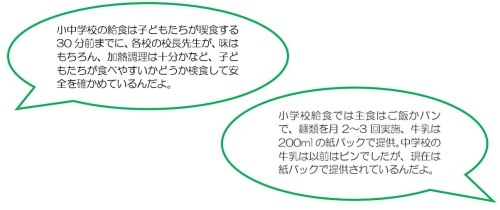 おかずや汁を保温性の高い食缶に入れて各学校に給食を届ける方式で、保温性が高いので、温かいものは温かく、冷たいものは冷たく提供することができます。また、衛生管理上からも、細菌が増殖しやすい10℃から65℃の温度帯を避けることができ、衛生的で安全でおいしい給食を届けることができます。以前の弁当給食に比べ温かい給食を食べることができ、加えて、汁物やカレーなども献立に取り入れることができるようになったそうです。